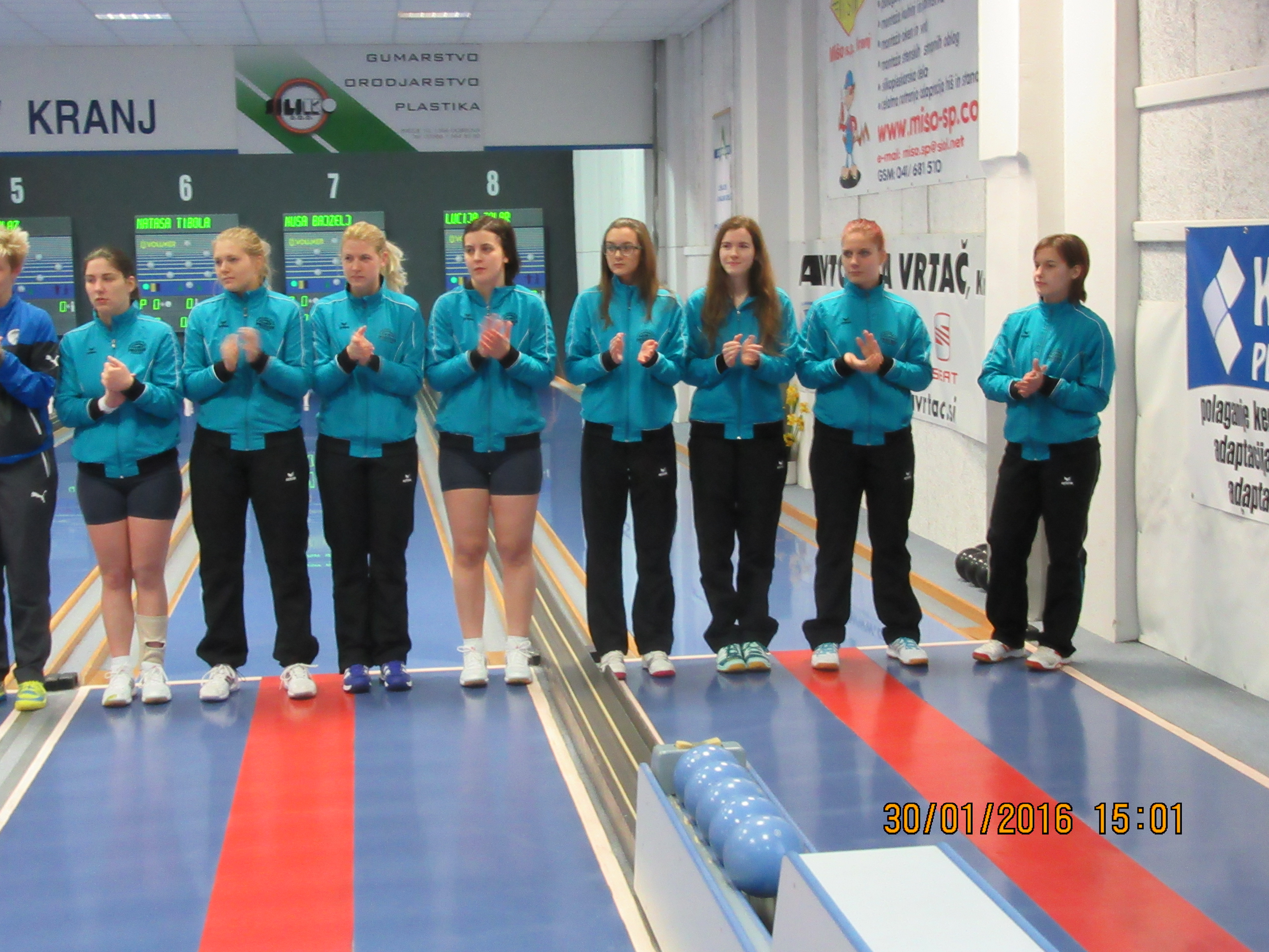 Domača ekipa je v prvi par postavila Nino Blaž in Nušo Bajželj, mi pa smo v ogenj poslali Natašo in Lucijo. Obe naši tekmovalki sta od kegljanja pokazali zelo malo, Natašo smo po 70 lučajih zamenjali z Maruško. Žal je Maruška le nadaljevala z Natašino slabo igro. Obe skupaj sta izgubili in domačinke so povedle z 2 : 0 in si že takoj na začetku priigrale 118 kegljev prednosti.